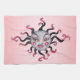 This custom kitchen towel is light pink in the center fading to a darker pink at the ends with a pretty fantasy lady sun with a gray face having pink lips and pink circle cheeks with long black eyelashes and fancy scrolled black and pink rays.