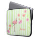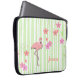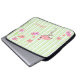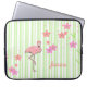 Pretty laptop cover done in a white and light green striped pattern. Graphics of pink flamingo and colorful pink and peach flowers decorate the striped background. Pink script text, on the bottom, is ready to personalize with your name. Makes a great gift idea. Chose the size you need.