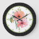 Pretty black and white polka dot wall clock, with a green and white circle, in the middle, with gorgeous watercolor painted flowers. Green hour marks, run around the edge of the white circle. Customize to add your own text to the lovely clock.
