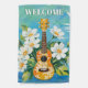 Welcome your visitors with a musical flourish, with this pretty outdoor flag. The flag pictures a classic ukulele, with decorative wood, on a backdrop of turquoise water, white flowers and green leaves. At the top, the word 'Welcome' is in clear capital letters. The design is the same on both sides of the flag. Ideal for ukulele players and fellow music lovers.