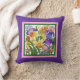 Pretty floral pillow, painted irises framed in pink/green, on a dark purple pillow.