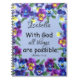 Customizable name spiral notebook with the inspirational and encouraging bible verse "with God all things are possible." from Matthew 19:26, with watercolor painted blue and purple pansy flowers.