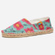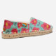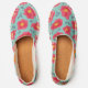 Pretty floral espadrilles created with a vector illustration of a pattern of abstract flowers with bright pink petals over light blue background.