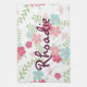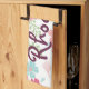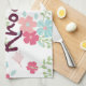 A pretty floral colored kitchen towel this design features a pink and blue floral design on a white background. Your name is written across in beautiful purple font.