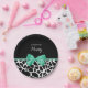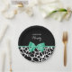 Girly black and white giraffe print paper plates with a pretty mint green ribbon tied into a cute bow. Personalize this trendy animal print design by adding the name of the party girl. Flat printed image, not actual bow.