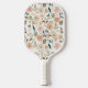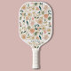 This pretty, stylish pickleball paddle features a floral pattern in gold, teal, blush pink, and off-whie over a custom color background (shown in ivory). A text template is included for personalization (on both sides)!