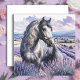 Blank greeting card. Pretty white and gray horse standing in a pretty field of lavender. This was created with ai and done in a watercolor style.