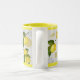 Bright happy coffee mug with lemons on dove gray background with sketches of fruit. It is part of a matching set (tablecloth, kitchen towel and wall clock.)