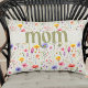 Mom pillow in soft green with colorful wildflower pattern and bold modern lettering. The design features pretty wild flowers with "mom" lettered in ornate typography. Please browse my Mother's Day Wildflower Collection for more flowery cards and gifts.