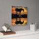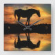 A stunning horse clock set against a southwestern-colored sky, its vibrant hues perfectly mirrored in a calm, still pond. Truly a beautiful clock.
