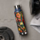 A bird themed water bottle with an impasto painting style colorful red, blue and yellow Macaw and flowers.