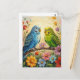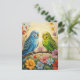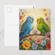 A pretty postcard to say hi and keep in touch with a friend or family member who loves parakeets! On the front is an impasto painting style blue and green parakeets and flowers.