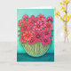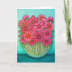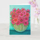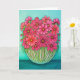A stylized, vibrant floral painting of cosmos in many shades of pink in a glass vase on a turquoise background on a greeting card by Lisa Lorenz