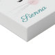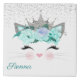 Sweet girl's room canvas print with graphics of a cute kitty face with pink heart shaped nose, big eye lashes, silver ears and crown and teal flowers on her head. Graphics of silver glitter sprinkles down from the top of the canvas. Personalize the teal colored text to suit your needs.