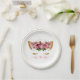 Sweet baby shower paper plate done in white, with graphics of a gold thin rim around the outer edge. Graphics of an adorable kitty face with pink heart shaped nose, big golden eye lashes and ears, with pink flowers, decorates the center of the plate. Customize to add any text you want. Matching products are available.