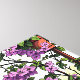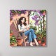 Beautiful relaxing wall art depicting a nice summer day. A pretty ai illustration of a woman sitting outside on her patio relaxing, with a cup of warm coffee and her dog sleeping at her feet. She is surrounded by lovely potted and hanging plants a pretty purple Clematis.