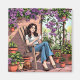 Beautiful relaxing magnet depicting a nice summer day. A pretty ai illustration of a woman sitting outside on her patio relaxing, with a cup of warm coffee and her dog sleeping at her feet. She is surrounded by lovely potted and hanging plants a pretty purple Clematis.