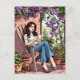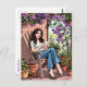 A postcard to keep in touch with a friend. A pretty ai illustration of a woman sitting outside on her patio relaxing, with a cup of warm coffee and her dog sleeping at her feet. She is surrounded by lovely potted and hanging plants.