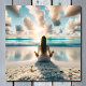 Beautiful ai illustration of a woman meditating on a beach full of sea glass, pretty blue waves and fluffy floating clouds.