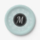 Romantic paper plates with mint blue floral wreath and personalized monogram.
