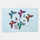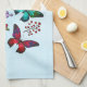A kitchen towel designed with elegant fluttering butterflies in many bright colors, such as green, orange, blue, red and pink. Whimsical florals add a whimsical touch. Set on a light blue watercolor background.