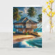 Wishing you a happy and peaceful birthday. Pretty ai art with a big log cabin beach house on the ocean watercolor style with palm trees blowing in the breeze.