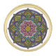 Pretty mandala with pink rosette center also filled with gold and purple. Surrounded with colorful enamel looking equally spaced shapes into a mandala. Most prominent colors are gold, purple, green, silver, light and dark pink, and turquoise.