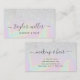 Modern makeup business card design featuring colorful faux holographic & silver glitter texture, elegant calligraphy font.