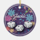 Colorful flowers and three lucky Bunco or Bunko dice make up the design on this Christmas ornament. Customize with a monogram of your favorite Bunco players name.