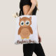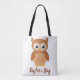 This tote bag is a cute personalized owl design. Featuring a cute brown owl with large gray eyes that just beckons for you, it has personalized text underneath. The text is written in fun cursive brown. The background is white. Great for everyday use, personalize your tote bag today!