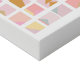A cute and fun design of little squares with a variety of geometric shapes in pretty pastel colors of pink, coral, and yellow paired with a golden shade of amber.