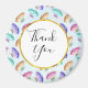 A thank you magnet with a beautiful pattern. Watercolor butterflies, painted in pastel colors including pink, purple, blue, yellow and green. A light blue watercolor background with hints of light pink. Thank you written inside a white circle with a faux-gold foil border.
