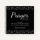 Pretty personalized black floral prayer journal. Design includes a pale gray floral print set against a rich black background, with pale gray typography. The text reads 'The Lord who watches over His children will neither slumber nor sleep', which is loosely based on Psalm 121. This text and the placeholder name are CUSTOMIZABLE, so you can personalize with your own wording and name. Great gift for your daily prayer journaling, either morning or bedtime.