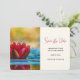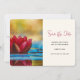 Save the date card with a photograph of a pond with a lovely red lotus flower poking out on top.