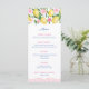 A pretty pink and white menu card design with watercolor lemons and pink flowers. Shown here for a bridal shower but would also work well for a baby shower to welcome a little girl or a birthday party.