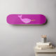This awesome skateboard features a digital art image of a pretty and magical pink baby girl Narwhal. The main body of the Narwhal has a rough texture and is bright pink while the belly is a paler shade of pink. The Narwhal has a black eye with a pale pink pupil and a shiny gold horn on its face. It also has a delicate tail and flippers.