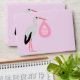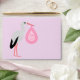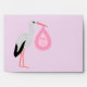This envelope features a graphic image of a cute white Stork with black tail feathers holding onto a pale pink bundle of blankets. There is pink text on the bundle that says "Baby Girl". This design is perfect for celebrating a baby girl.