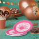 This awesome set of Baby Shower paper party plates features a digital art image of a pretty pink Baby girl Thanksgiving Turkey. The Turkey has a bright pink body with pink tail feathers sticking up. It has pale pink legs and beak and pretty pale pink eyelids.