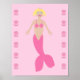 This awesome poster features a digital art image of a pretty pink Mermaid. She has blonde hair and blue eyes and a pink shell top. Her tail is pink and covered in pretty pink shining diamond shaped scales. She is wearing a gold heart shaped necklace and a gold ring on her fingers. Her nails are pink and she has pink lipstick on. She also wears a beautiful pink bow in her hair.