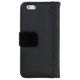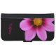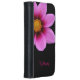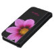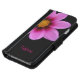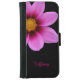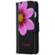 Elegant iPhone 6 wallet style case done in jet black, with a photo of a bright pink flower, in the upper left corner of the case. Personalize the bright pink text for yourself or as a lovely gift idea for her.
