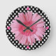 Pretty decorative wall clock done in a black and white polka dot pattern. A pink graphically enhanced Gerber daisy bloom, decorates the middle, and four pink buttons denotes the quarter hours. Customize to add any text you might want. Stylish clock that makes a great gift idea.