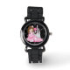 Here's a pretty watch that any little girl will love! It features a princess in a pink dress, with her pink and silver castle in the background. The princess holds a pink star wand. Silver numbers make the watch easy to read. Everything is placed on a black background. *Graphics by PrettyGrafik Design.