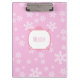 Usher in the winter season with an eye catching clipboard. This color theme caught my eye because it reminded of the excitement and wonder of winter while adding a dreamlike quality. Unlock your imagination with this lovely clipboard. Featuring a soft pink background with lovely white snowflakes, you can personalize your name within a pink label. Purchase your very own clipboard today.