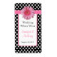 Stylish black and white polka dot mini wedding wine labels ready for you to personalize with your own information. A pink edged white text area, in the middle has pink and black custom text and graphics of a pink ribbon, with a pink Gerber daisy decorating the top. Great for your wedding reception or your home made wines.