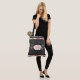 Stylish all over print tote bag done in black, with a white polka dot pattern. Graphics of a pretty ribbon with pink roses decorate the top and bottom of the bag, and a decorative text area, in the middle. Personalize the pink text to read what you want. Pretty carry all bag that makes an excellent gift idea for her.