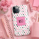 Pretty and girly, this affordable phone case features pink, black and gray polka dots on a white background. In the center is a monogrammed box with a template for inserting your initials. Personalize yours today!