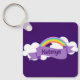 Beautiful purple keychain which features a cute cheerful rainbow with fun white clouds on a pretty violet background. Customize with a name for a great LGBTQ gift.