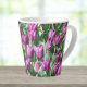 Chill out with a coffee latte in this ceramic mug that features the wrap-around photo image of a spring garden of pretty, purple Tulips. Select your latte mug size. A lovely, floral design for springtime!