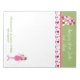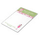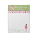 Colorful quilting business custom note pad done in white, with a green header, at the top, with a heart decorated scalloped border. Graphics of a cute angel and a colorful pink, green, and white quilt decorate the note pad. Personalize the text to read anything you want.