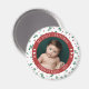 Pretty baby's first Christmas photo magnet with a round photo of your baby with curved text and a pretty red berry and greenery pattern and cute hearts. Give your fridge a festive touch with this baby's first Christmas magnet personalized with name and photo of your bundle of joy!